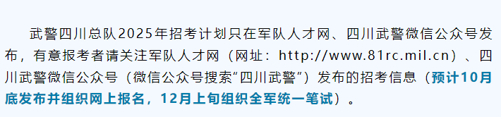 昨日,四川武警官方微信公眾號(hào)發(fā)布《預(yù)告!武警四川總隊(duì)2025年面向社會(huì)公開招考文職人員》,寫到:預(yù)計(jì)10月底發(fā)布并組織網(wǎng)上報(bào)名,12月上旬組織全軍統(tǒng)一筆試。