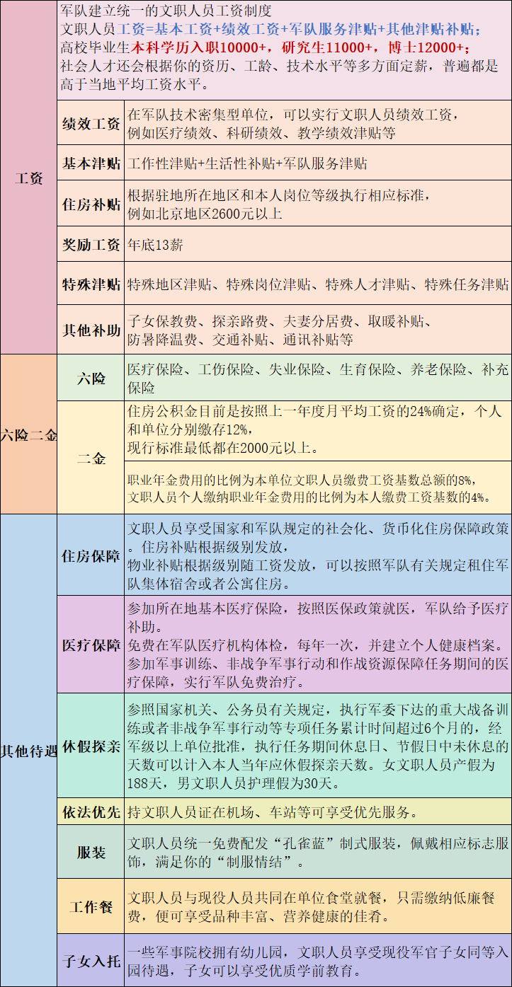 軍隊文職的待遇是參照現(xiàn)役軍官來定的,公務(wù)員的各項福利,軍隊文職也有,而且軍隊文職的工資水平是高于公務(wù)員的。