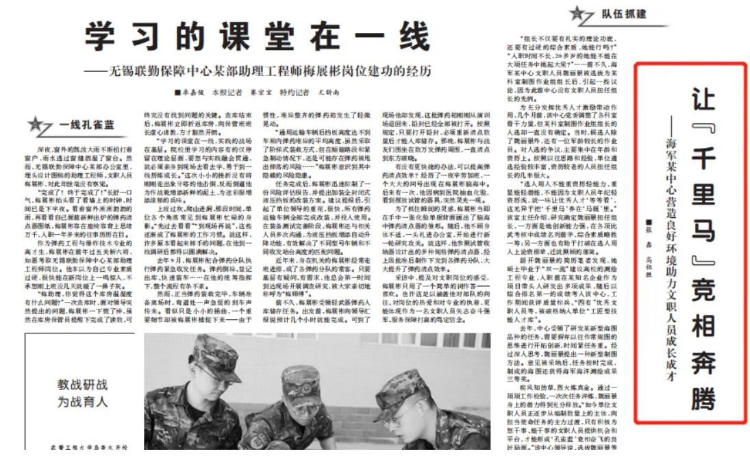 同年7月5日解放軍報發(fā)表的《讓“千里馬”競相奔騰》一文中提到海軍某中心文職人員魏某某被選拔為某科室組長后,打破了此前單位沒有文職人員擔(dān)任組長的先例。