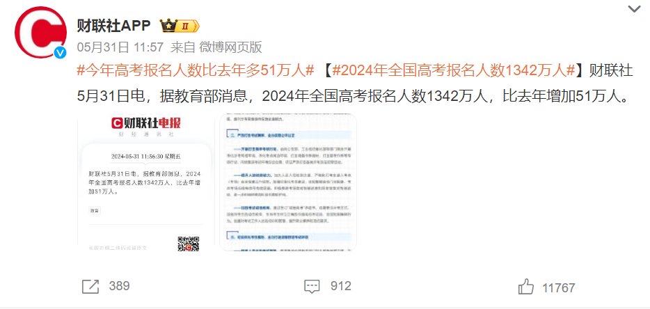 根據(jù)財(cái)聯(lián)社5月31日電可知:今年高考報(bào)名人數(shù)1342萬(wàn)人,比去年增加51萬(wàn)人。