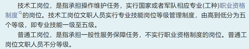 技術(shù)工一般承擔(dān)操作維護(hù)性工作,技術(shù)性要求較高,分為五個(gè)等級(jí),可晉升。普通工一般從事保障性工作,不分等級(jí)。