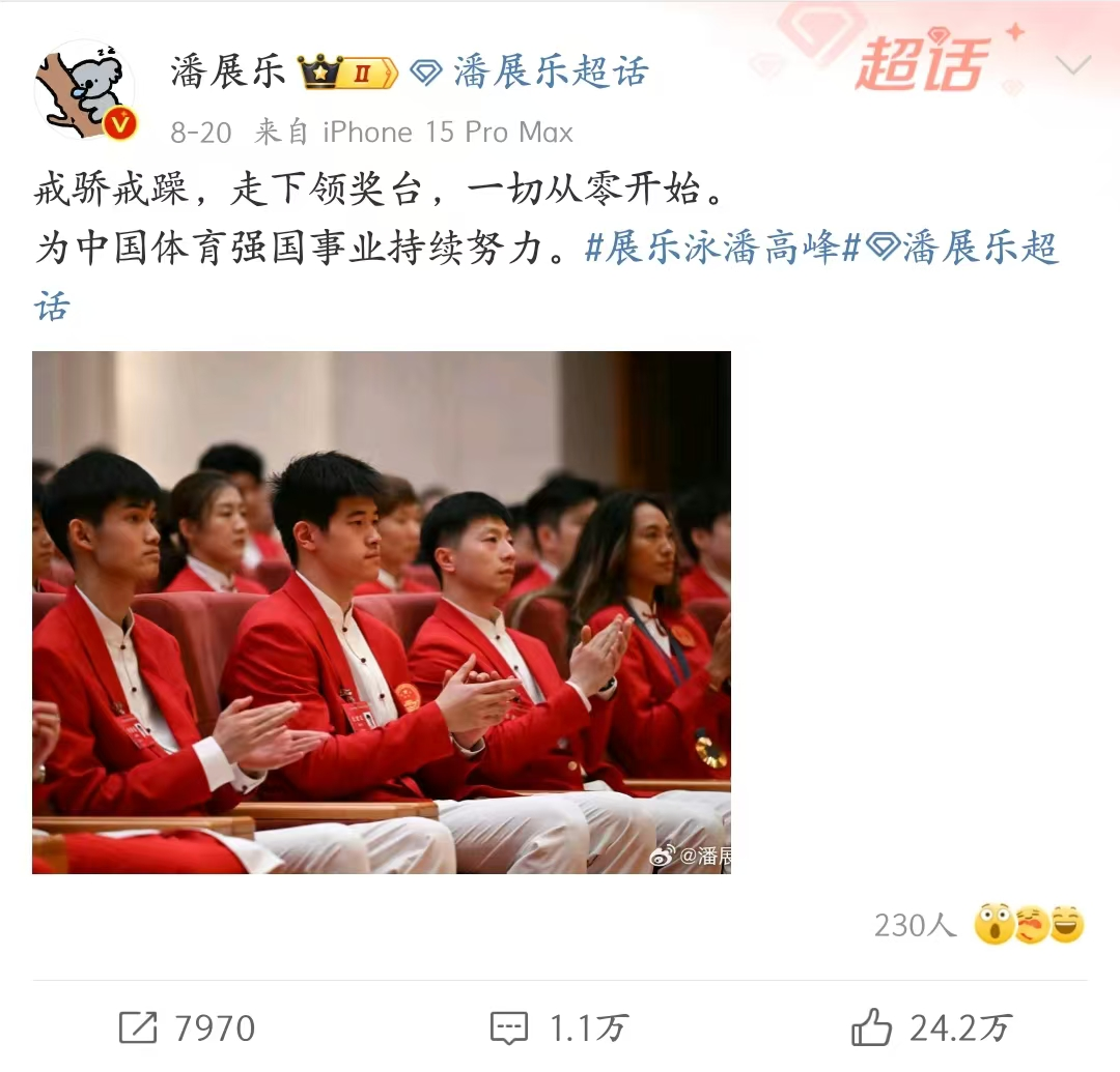 潘展樂(lè)奪冠后并未沉浸于榮耀之中,而是一切清零,為下一個(gè)目標(biāo)繼續(xù)努力。