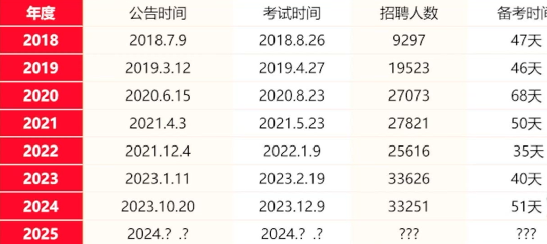 從2024年,公告時間和考試時間基本確定為每年的第四季度,預(yù)計12月份組織筆試。在考研之前,在國考之后。預(yù)計2025年會在10月發(fā)布公告,12月組織筆試,但是不排除9月底發(fā)布公告。
