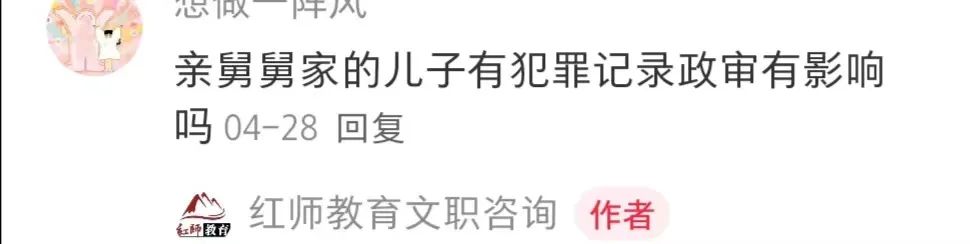 除了對政治條件有特殊要求的崗位以外,大部分崗位是不考察叔叔、舅舅、姨媽等旁系親屬的。但是如果考生的旁系親屬是監(jiān)護人或者直接撫養(yǎng)人,構成了法律關系,那么這些人員就會被列入考核范圍。