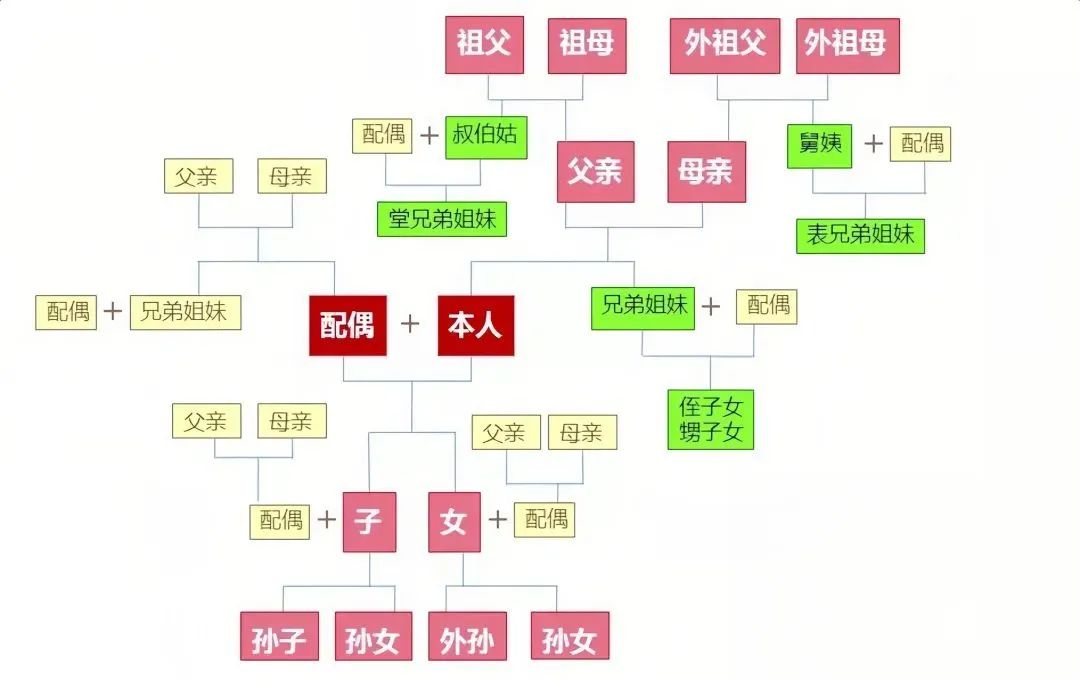 (粉色為直系血親;綠色代表三代以內旁系血親;黃色代表近姻親關系。)