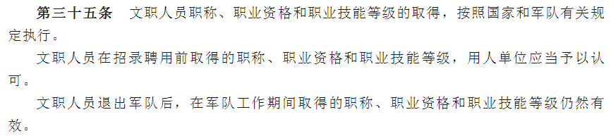對招錄聘用前后在軍隊(duì)或者地方獲得的職稱、職業(yè)資格或者職業(yè)技能等級予以互認(rèn)。