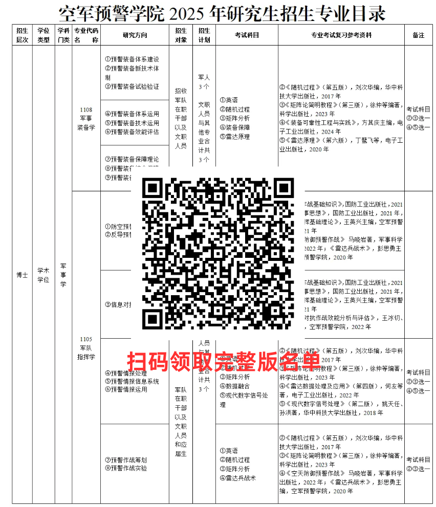 (四)軍隊院校直讀應屆碩士畢業(yè)生報考我院博士研究生的,須在2025年1月前獲得碩士學歷學位證書,不得報考部分軍事學博士研究生(具體可報考專業(yè)詳見附表)。