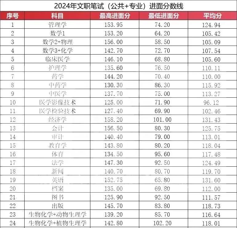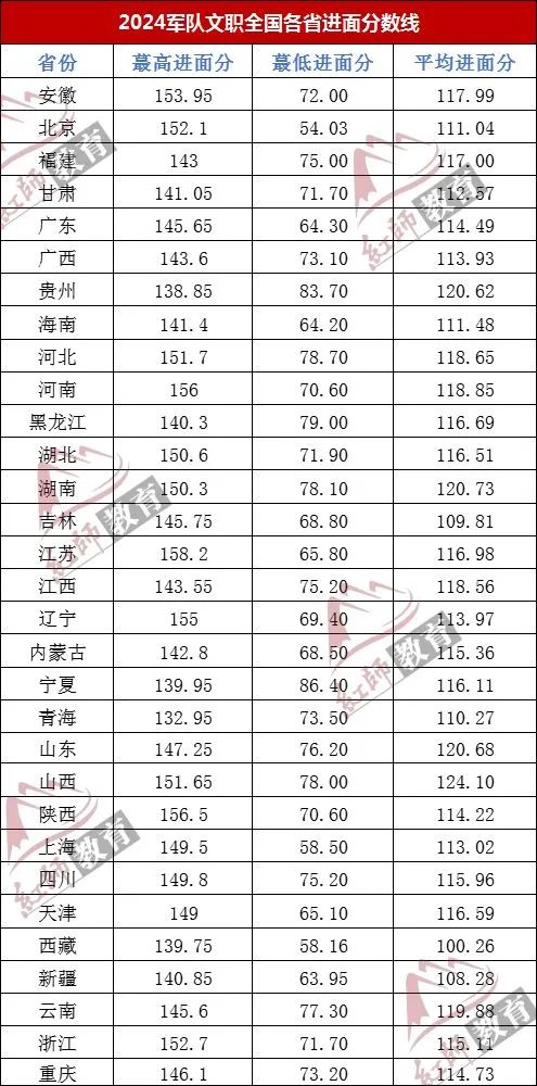下圖是2024年軍隊文職全省進面分數(shù)線匯總,大家可以作為參考。