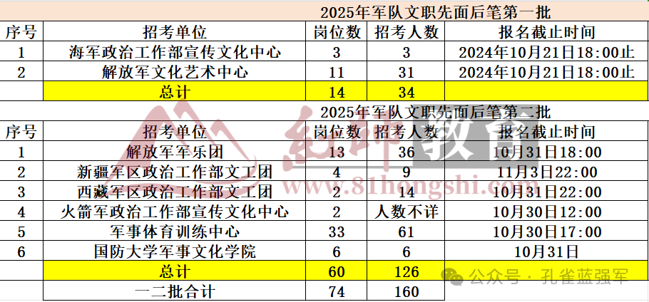 2025年軍隊文職先面后筆第一二批公告已經(jīng)先后發(fā)布,共計8個招考單位發(fā)布了崗位計劃,相較于2024年,陸軍政治工作部宣傳文化中心還沒有消息。報名文體崗的考生,需要注意報名截止時間,避免錯過。