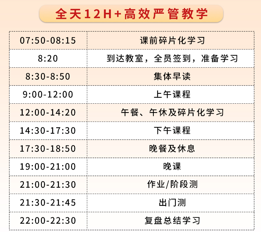 以“重回高三時光”為核心理念,構(gòu)建半封閉、高強度、精細化的備考體系,通過嚴格管理 +精準(zhǔn)教學(xué)+貼心服務(wù)三位一體模式,為考生打造沉浸式學(xué)習(xí)環(huán)境,助力實現(xiàn)成績突破與夢想進階。