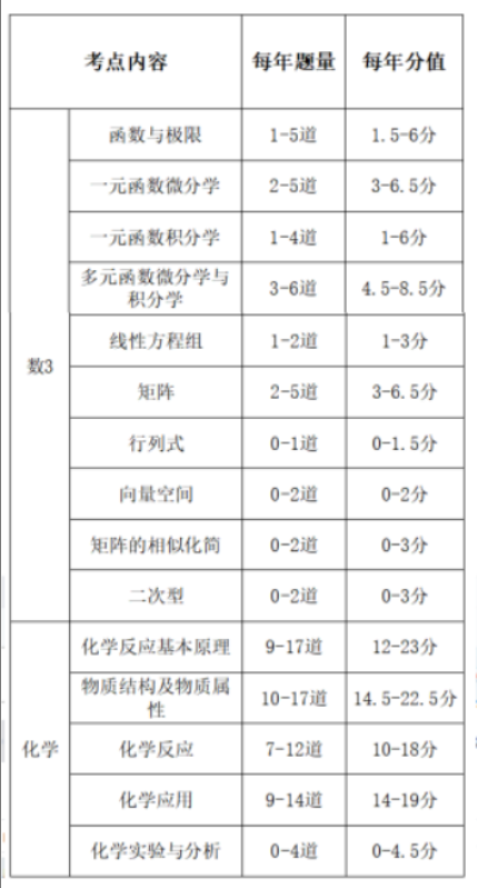 根據(jù)軍隊文職考試大綱要求和歷年軍隊文職筆試情況,“數(shù)學(xué)3+化學(xué)”科目考題內(nèi)容及分值分布如下: