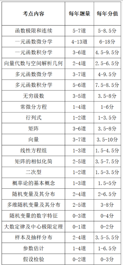 根據(jù)軍隊文職考試大綱要求和歷年軍隊文職筆試情況,“數(shù)學1”科目考題內容及分值分布如下: