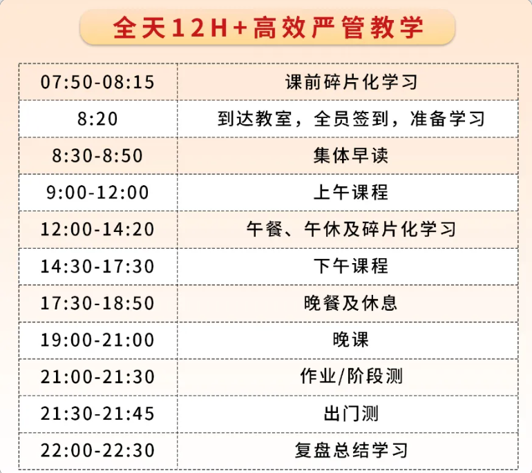 以“重回高三時(shí)光”為核心理念,構(gòu)建半封閉、高強(qiáng)度、精細(xì)化的備考體系,通過嚴(yán)格管理 +精準(zhǔn)教學(xué)+貼心服務(wù)三位一體模式,為考生打造沉浸式學(xué)習(xí)環(huán)境,助力實(shí)現(xiàn)成績突破與夢想進(jìn)階。