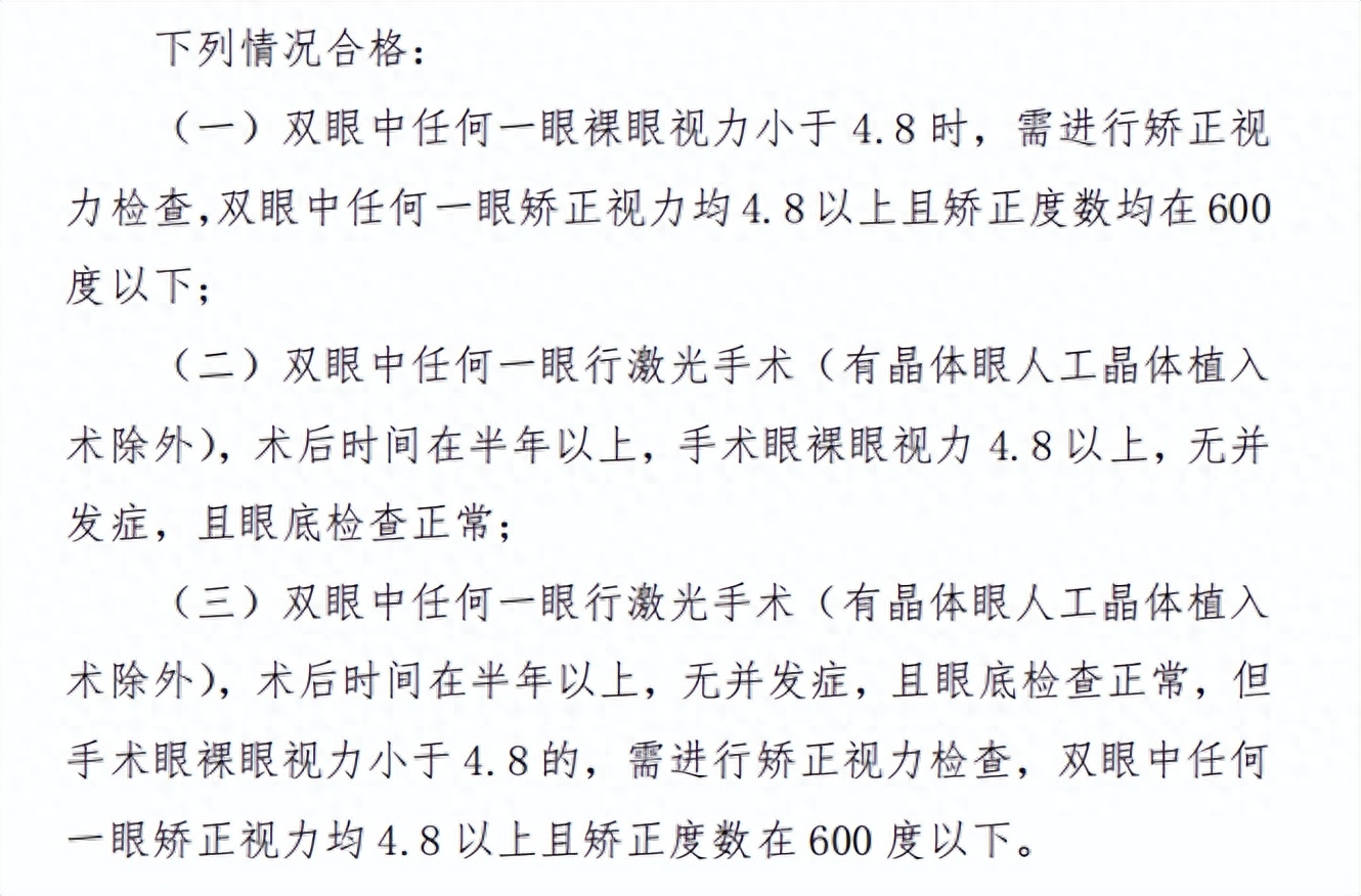 視力:每一眼矯正視力4.8以上且矯正度數(shù)800度以下,無(wú)明顯視功能損害眼病,合格。(其中管理崗和專業(yè)技術(shù)類中的醫(yī)療衛(wèi)生、實(shí)驗(yàn)、體育崗矯正度數(shù)需600度以下)