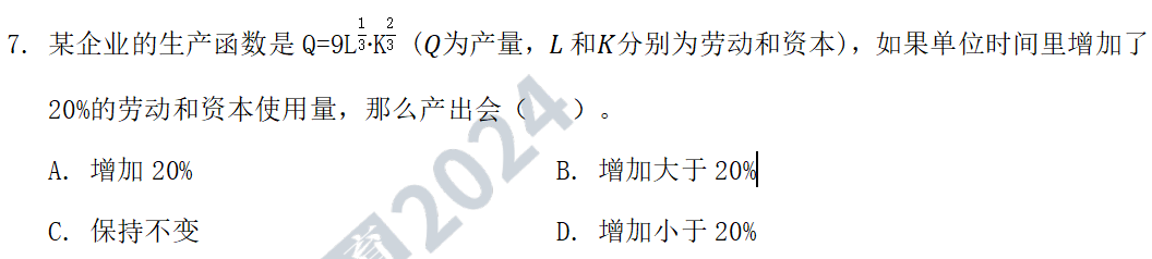 7.答案:A。解析:本題考查規(guī)模報(bào)酬的含義。規(guī)模報(bào)酬分析是考查當(dāng)企業(yè)內(nèi)部各種生產(chǎn)要素投入量按相同比例變化時(shí)所帶來的產(chǎn)量變化,分為規(guī)模報(bào)酬不變、規(guī)模報(bào)酬遞減和規(guī)模報(bào)酬遞增。產(chǎn)量增加的比例等于各種要素投入量增加的比例,稱為規(guī)模報(bào)酬不變;產(chǎn)量增加的比例小于各種要素投入量增加的比例,稱為規(guī)模報(bào)酬遞減;產(chǎn)量增加的比例大于各種要素投入量增加的比例,稱為規(guī)模報(bào)酬遞增。該函數(shù)為柯布道格拉斯生產(chǎn)函數(shù),且具有規(guī)模報(bào)酬不變的經(jīng)濟(jì)特征,所以,勞動(dòng)和資本均增加20%,產(chǎn)量也增加20%。故正確答案為A。