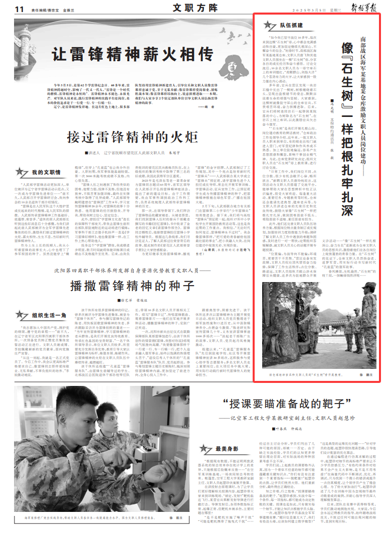 “日常工作中,我們崗位不同、點(diǎn)位分散,很少有機(jī)會(huì)敞開心扉、暢所欲言。”新聘文職人員唐玲純坦言,這項(xiàng)活動(dòng)為文職人員搭建了交流平臺(tái),能夠幫助大家在思想辨析中校正認(rèn)識(shí)偏差,很受大家歡迎。每逢重大活動(dòng)、重要任務(wù)、專題教育等時(shí)機(jī),倉(cāng)庫(kù)還會(huì)邀請(qǐng)先進(jìn)典型、建庫(kù)老兵等,為文職人員講述倉(cāng)庫(kù)的光榮歷史和優(yōu)良傳統(tǒng),鼓勵(lì)大家像“石生樹”一樣把根扎牢扎深,做到困難面前不低頭、艱險(xiǎn)面前不退縮、重任面前有擔(dān)當(dāng)。