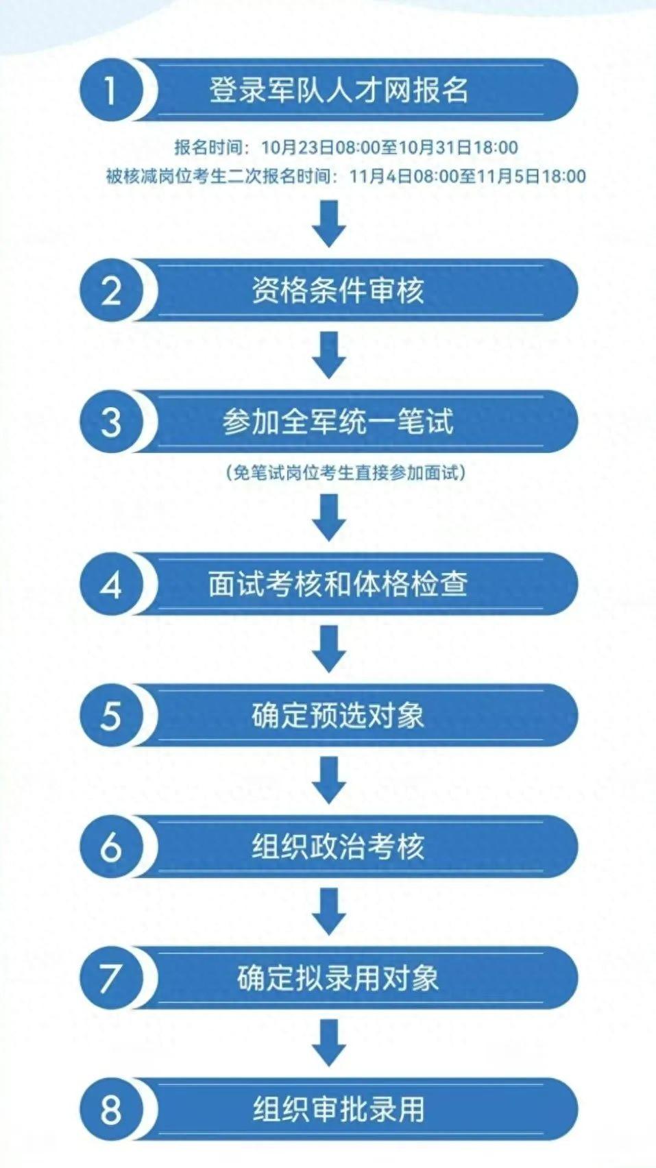 (3)全軍統(tǒng)一筆試于2023年12月9日進(jìn)行,內(nèi)容包括公共科目和1門相應(yīng)專業(yè)科目,主要考核報(bào)考人員的綜合素質(zhì)和專業(yè)基礎(chǔ)。①公共科目考試時(shí)間:2023年12月9日9:00-11:00;②專業(yè)科目考試時(shí)間:2023年12月9日14:00-16:00。報(bào)考人員可于2023年12月4日9:00至9日14:00,通過(guò)軍隊(duì)人才網(wǎng)打印本人準(zhǔn)考證,憑準(zhǔn)考證和居民身份證(臨時(shí)居民身份證)在指定的時(shí)間和地點(diǎn)參加全軍統(tǒng)一筆試,兩證缺一不可。