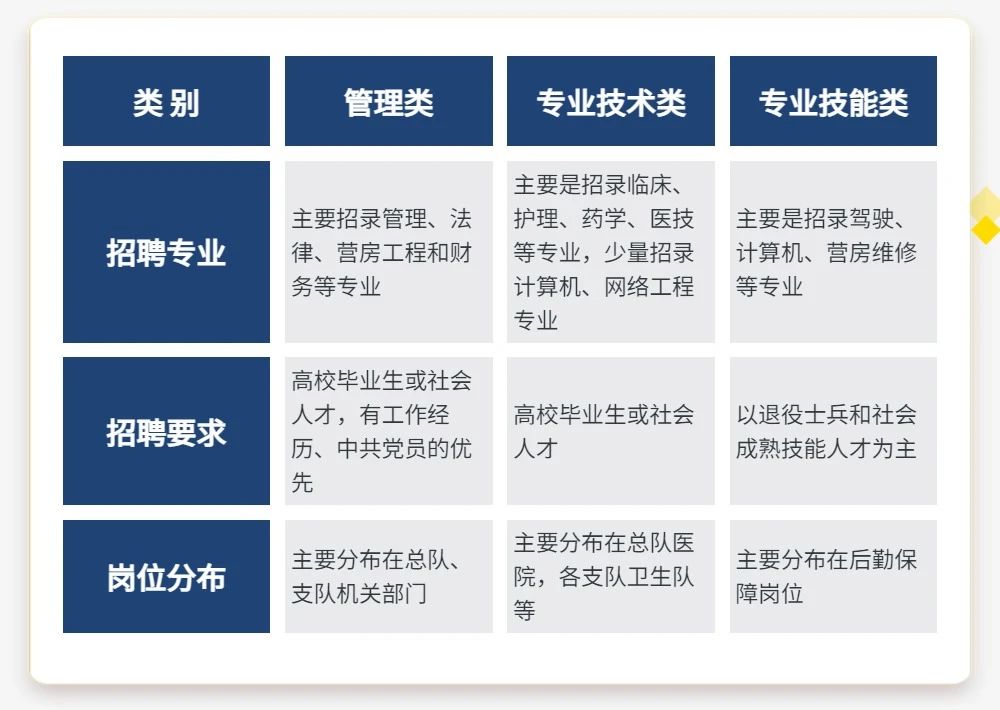 近年來,總隊(duì)先后面向社會(huì)公開招考文職人員,目前缺口還比較大,每年公開招考計(jì)劃約120個(gè),主要分3類。