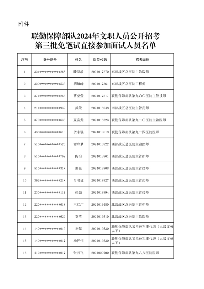 原文標(biāo)題:公布聯(lián)勤保障部隊(duì)2024年文職人員公開招考第三批免筆試直接參加面試人員名單
