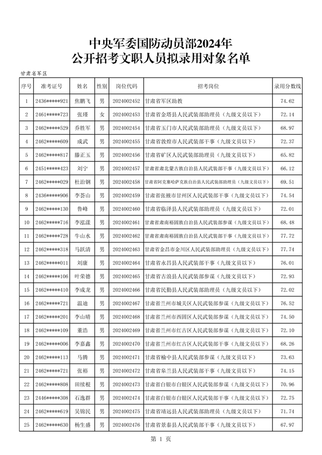 原文標題:中央軍委國防動員部2024年公開招考文職人員擬錄用對象名單