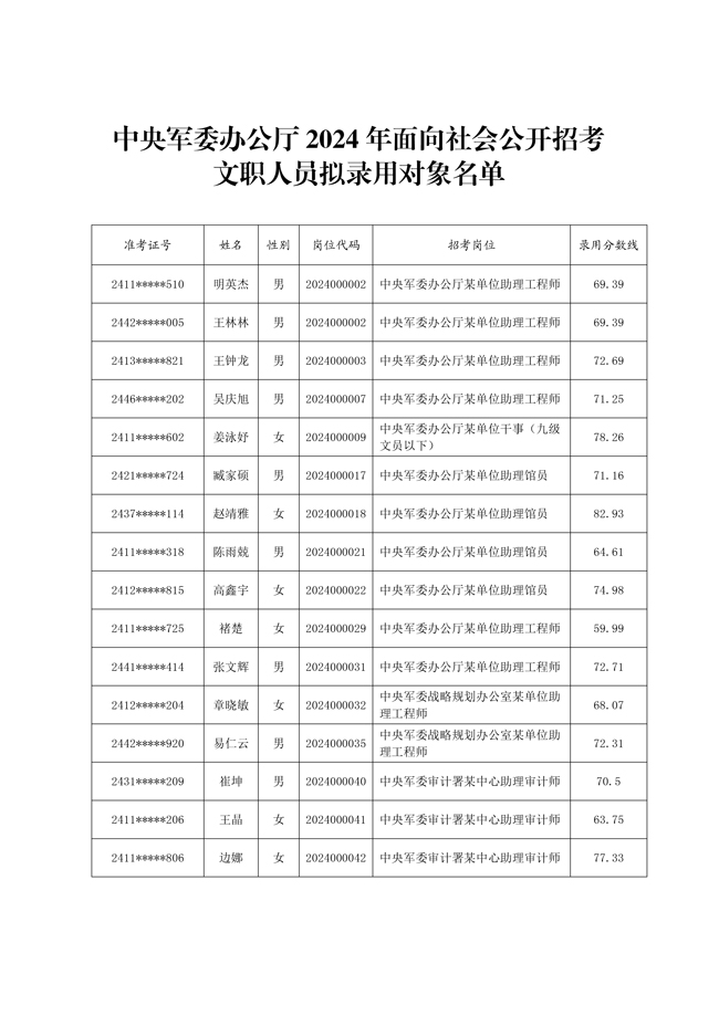 原文標題:公示中央軍委辦公廳2024年面向社會公開招考文職人員擬錄用對象名單