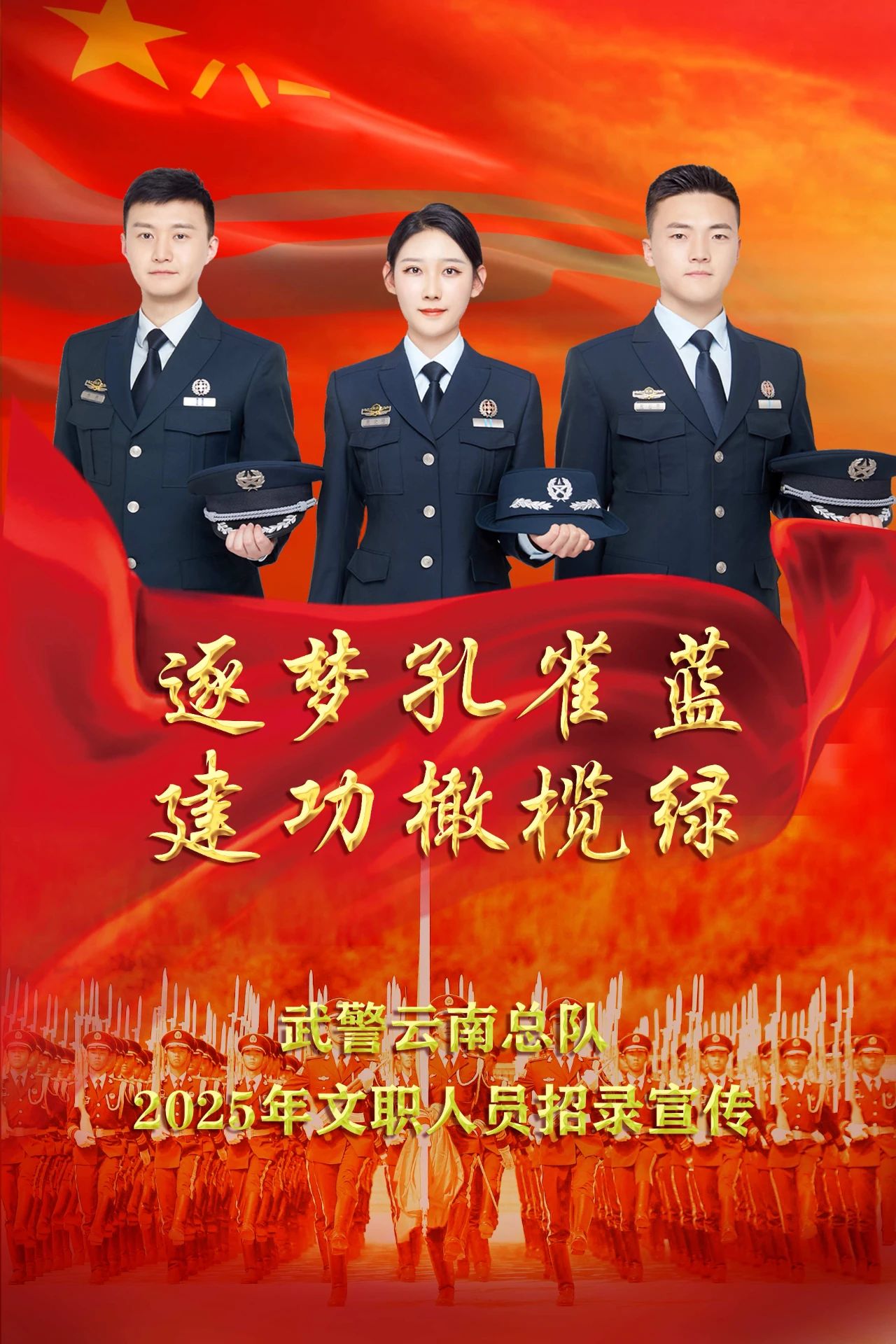 為把社會知識精英、技術精英、管理精英集聚到強軍旗幟下,推動社會人力資源優(yōu)勢轉化為部隊人才優(yōu)勢,匯聚強軍興軍的磅礴力量,根據(jù)《中國人民解放軍文職人員條例》和全軍統(tǒng)一部署,現(xiàn)就武警云南總隊關于2025年面向社會公開招考文職人員相關事宜預告如下: