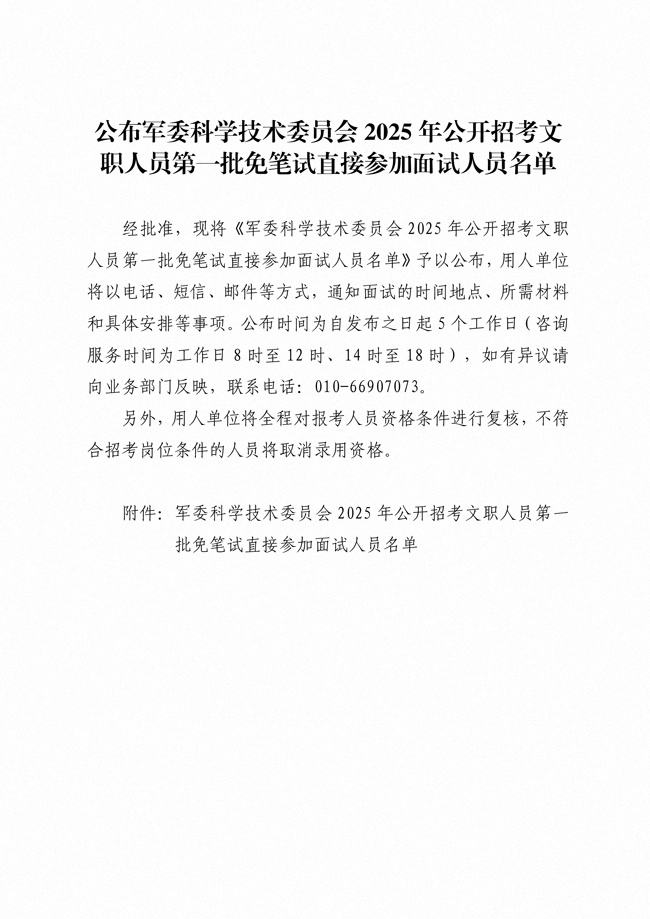 原文標題:公布軍委科學(xué)技術(shù)委員會2025年公開招考文職人員第一批免筆試直接參加面試人員名單