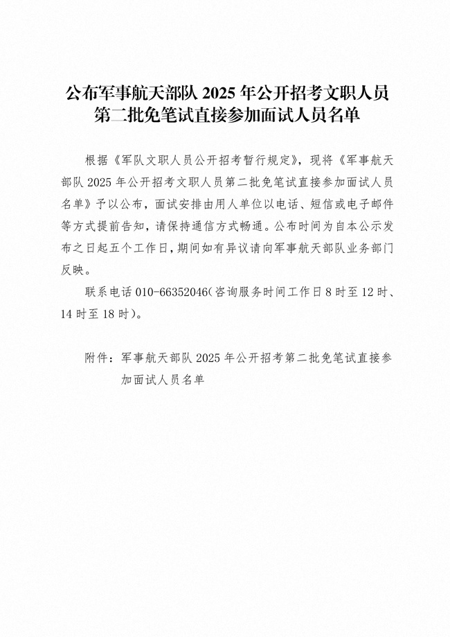 原文標題:公布軍事航天部隊2025年公開招考文職人員第二批免筆試直接參加面試人員名單