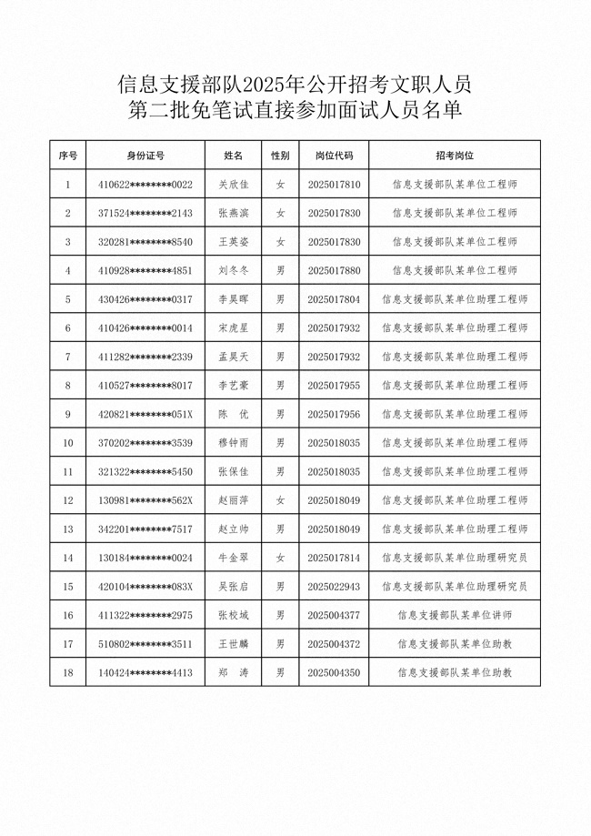 原文標(biāo)題:公布信息支援部隊(duì)2025年公開招考文職人員第二批免筆試直接參加面試人員名單