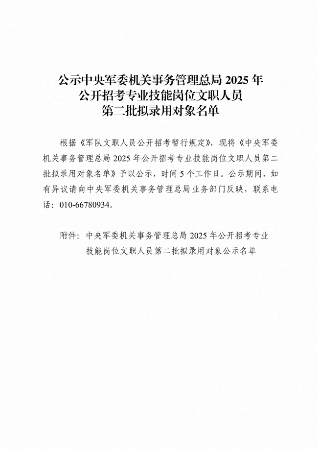 原文標(biāo)題:公示中央軍委機(jī)關(guān)事務(wù)管理總局2025年公開招考專業(yè)技能崗位文職人員第二批擬錄用對(duì)象名單
