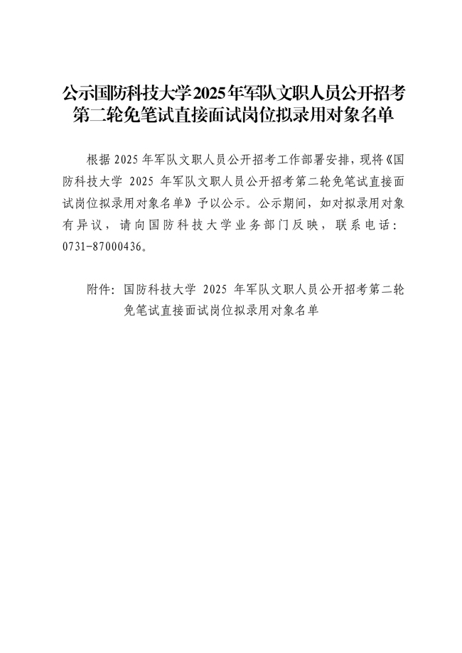 原文標(biāo)題:公示國(guó)防科技大學(xué)2025年軍隊(duì)文職人員公開(kāi)招考第二輪免筆試直接面試崗位擬錄用對(duì)象名單