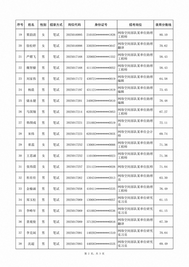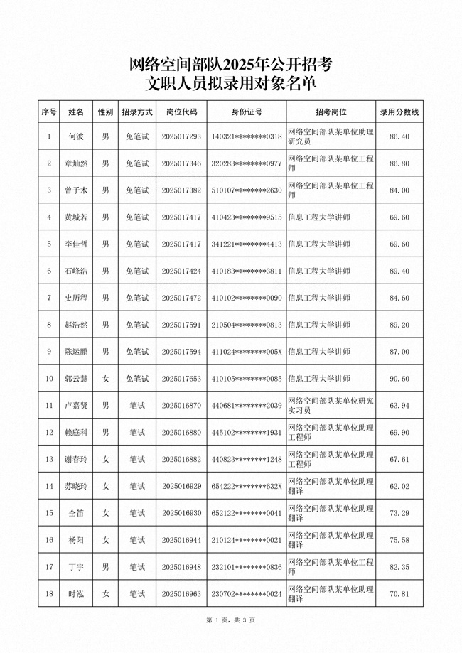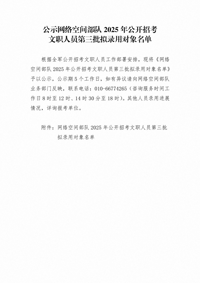 原文標題:公示網(wǎng)絡(luò)空間部隊2025年公開招考文職人員第三批擬錄用對象名單