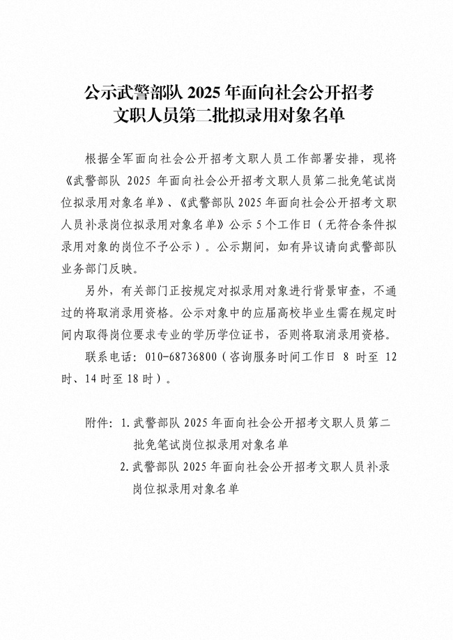 原文標題:公示武警部隊2025年面向社會公開招考文職人員第二批擬錄用對象名單