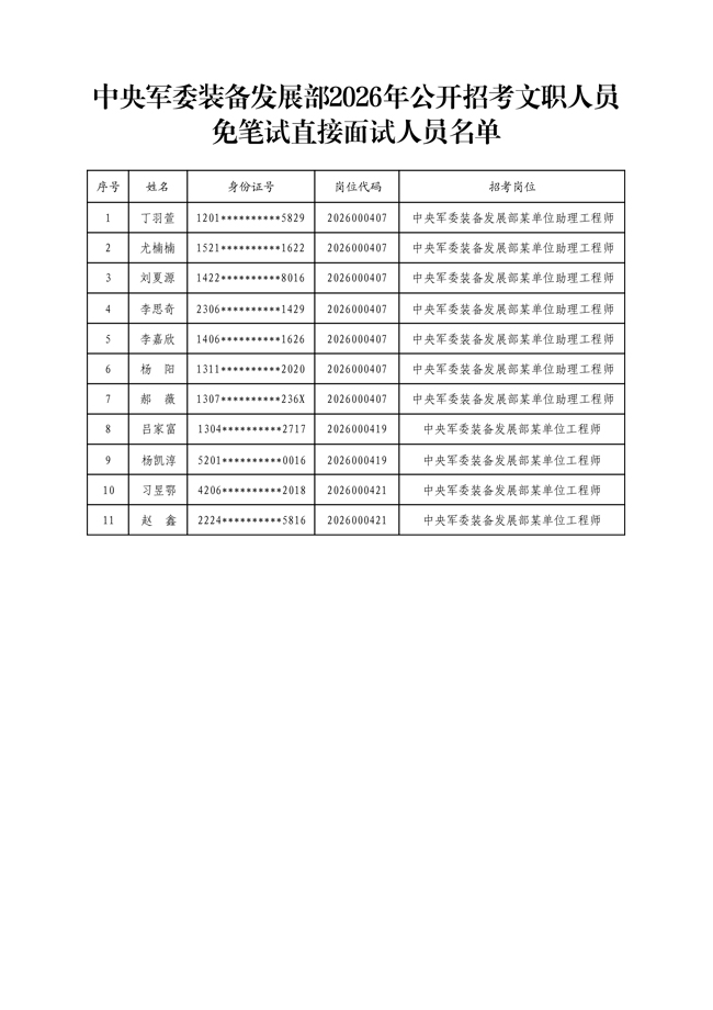原文標(biāo)題:公示中央軍委裝備發(fā)展部2026年公開招考文職人員免筆試直接面試人員名單
