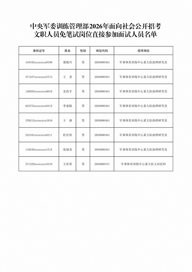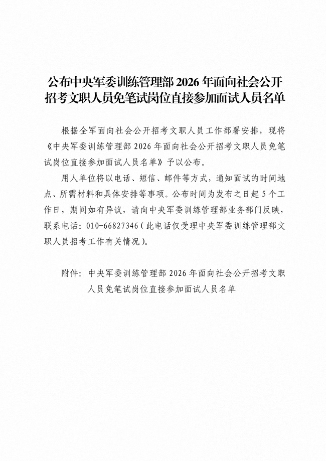 原文標(biāo)題:公布中央軍委訓(xùn)練管理部2026年面向社會公開招考文職人員免筆試崗位直接參加面試人員名單