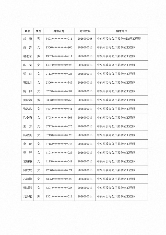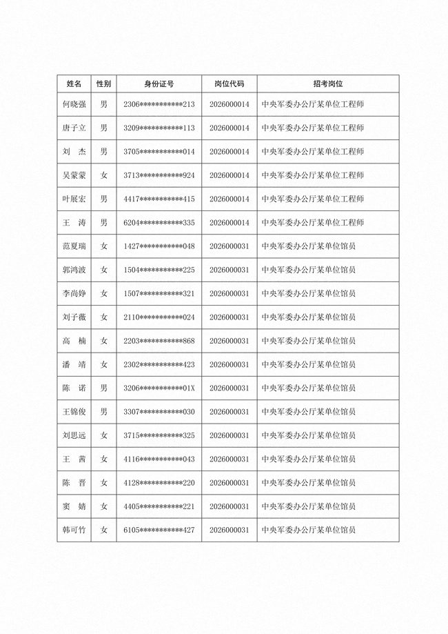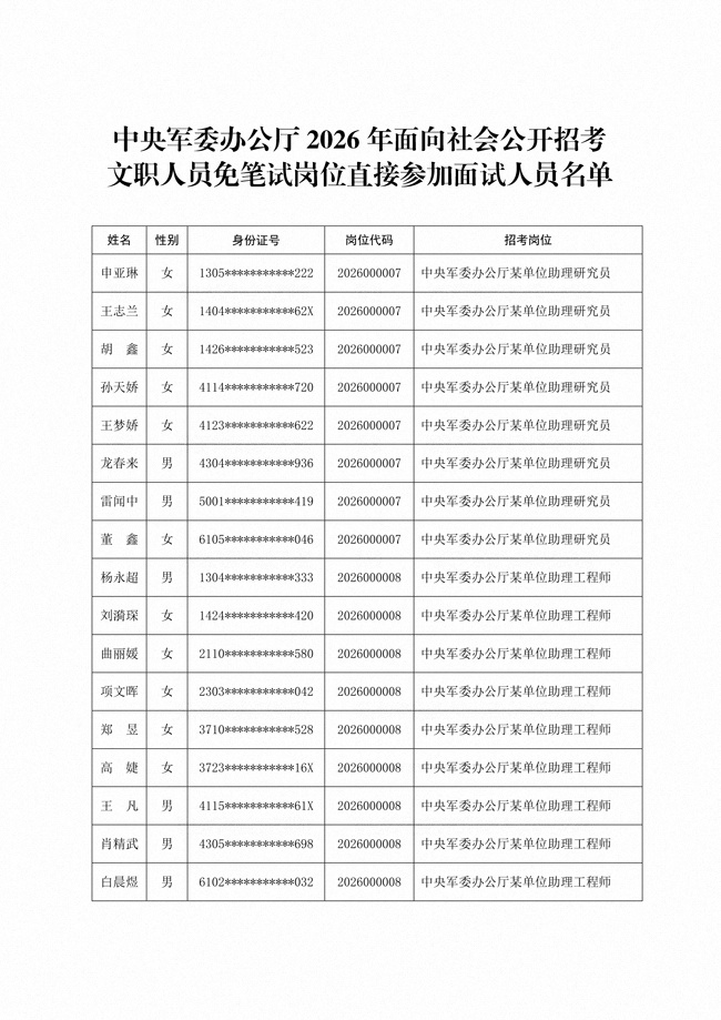原文標(biāo)題:公布中央軍委辦公廳2026年面向社會公開招考文職人員免筆試崗位直接參加面試人員名單